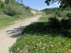 Wide partially shady path that leads through oak forest, past a market, and a Secret Garden with live music, to Avila Beach.