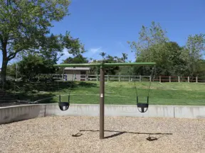 Park with plenty of benches in the shade, accessible playground with unusual equipment, tire swing, dome climby, wooden truck, dinosaur and dolphin bouncy, and plenty of swings.