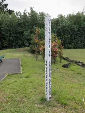 Beautiful statue backed by trees, with fruit and flower offerings below it. Huge lawn, narrow paths, picnic tables, and pedestrian bridge to Wailoa River State Park.