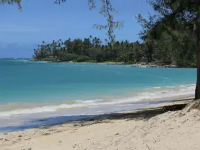 A curved beach of stunning blue-green water, lined with palm trees on one end, backed by ironwood forest, with piles of coral on the white sand, and kite surfers and mountains in the distance.