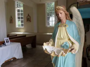 A church that miraculously survived the Lahaina fire. It's garden with mango trees and statues also survived, while beside it is rubble everywhere.