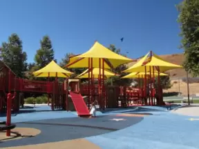 A super fun park with several unusual playgrounds, a rockclimbing wall, a Southern Pacific railroad engine, a swaying bridge, huge wavy slides on a hill, cement tunnels and more!