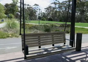 Lovely path beside a eucalyptus forest, on both sides of the creek, with workout stations, in a residential neighborhood. You can walk two miles total. Also called San Luis Ranch.