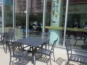 An outdoor mall under a huge banyan tree hung with lanterns. Beautiful flowers by a stream, rock-like seats kids love, and rain fountain.