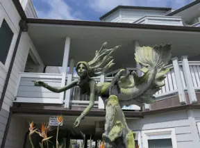 A tropical wonderland of palms, ferns, bromeliads, fountains, sculptures, rocks, ironwork gates, and pergolas, with the delightful scent of flowers filling the air.