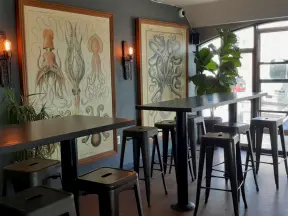 Trendy area with coffee shop, beer garden, wine bars, and cider bar, in industrial-style architecture with murals.