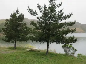 A steep 0.8 km walk through dry grasses over a hill and to the other side, with views of the lake on both sides.