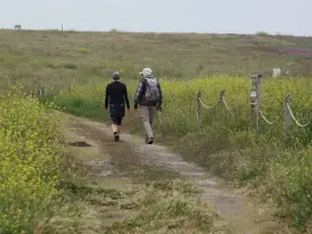 Steep walk up a narrow trail with wildflowers and ocean views. Loud noise from freeway (unless you take the inland trail), limited parking, and lots of people on mountain bikes.