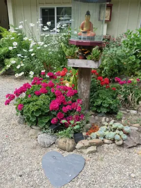 A peaceful 3-mile walk through oaky forest, past lush landscaping and a park with a historic adobe house, and among a neighborhood with gardens filled with flowers.