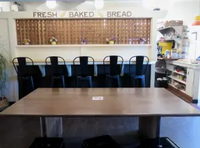 Health food store with great bakery, indoor seating with big windows, and outdoor picnic tables under thick leafy shade.