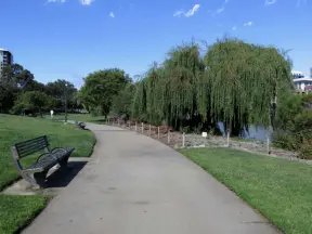 A lush park with rolling hills to run on, one-mile loop walking path, and basketball and sand volleyball courts. Currently has a crime problem.