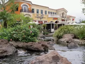 A shopping plaza with sidewalks cafes and shops that would look like Europe if it weren't so new!