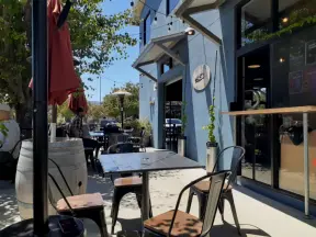 Trendy area with coffee shop, beer garden, wine bars, and cider bar, in industrial-style architecture with murals.