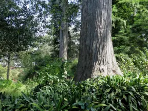 Incredible old trees from all over the globe, a stream, tropical plants, and flowers, all on a sloped plot of land.