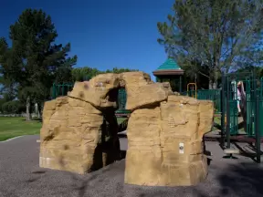 A super fun park with several unusual playgrounds, a rockclimbing wall, a Southern Pacific railroad engine, a swaying bridge, huge wavy slides on a hill, cement tunnels and more!