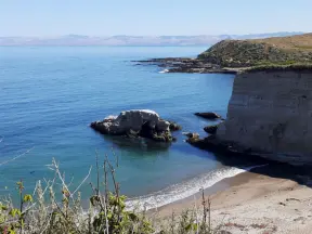 Rugged, beautiful cove with interesting rocks, sea glass, and shells on shore. Rock to climb, and water rushing into cove.