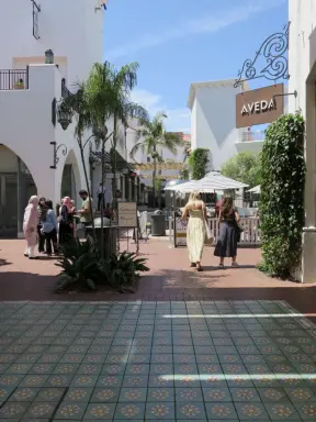 White Spanish-style buildings in an outlet mall, with views of hills from the parking lot.