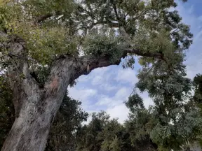 Lovely path beside a eucalyptus forest, on both sides of the creek, with workout stations, in a residential neighborhood. You can walk two miles total. Also called San Luis Ranch.