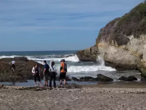 Rugged, beautiful cove with interesting rocks, sea glass, and shells on shore. Rock to climb, and water rushing into cove.