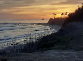 A secluded beach with golden bluffs, little birds running along the shore, a surfer or two, and forest behind.