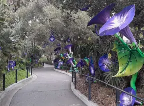 A tropical wonderland of palms, ferns, bromeliads, fountains, sculptures, rocks, ironwork gates, and pergolas, with the delightful scent of flowers filling the air.