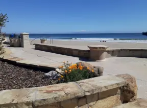 A glorious beach in Grover Beach town, with sand dunes and a wooden boardwalk, plus an octagon-shaped wooden pier in the sand.