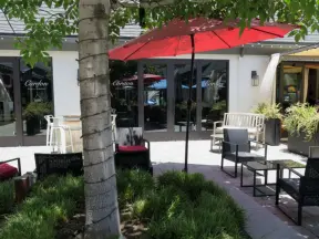 Quiet, leafy plaza with restaurants, BBQ place, ice cream cafe, coffee shop, and public space with tables, tucked away on the southern edge of downtown SLO.