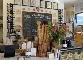 Our favorite bakery, and a street with colorful buildings and archways, lined with brasseries.