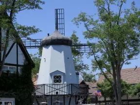 Half-timbered house over the ocean, with windmill and decorative lighthouse, and in summer, begonia house.