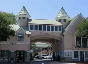 Shopping plaza with large trees and colorful architecture. Nice cafes and shops.