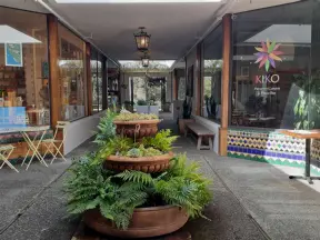 Trendy area with coffee shop, beer garden, wine bars, and cider bar, in industrial-style architecture with murals.