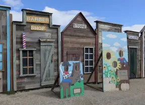 A wooden castle playground with gingerbread house, medieval towers, slides, bridges, monkey bars, rope bars, swings of all sorts, mist maker, viking ship, windmill, wild west town, rock-climbing wall, and tire swing.