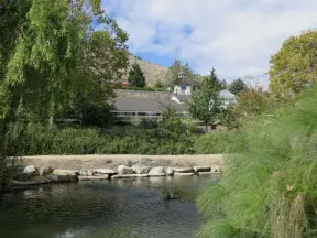Walking paths, plus pretty park with picnic spot on hill under trees, popular pickleball courts, playground, mountain views, field for dogs, tennis courts, and basketball court.