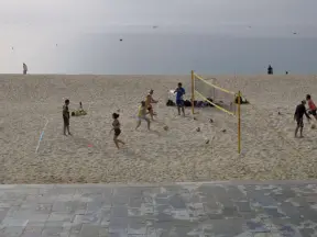 A flat, straight beach with a wide boardwalk where fitness reigns supreme! It reminded me of Venice Beach in California.