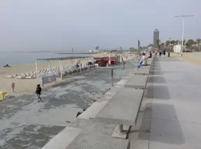 Boardwalk along a fairly grotty beach, where people rollerblade and stroll together.