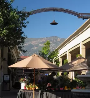 A pedestrian-only area on State Street with sidewalk cafes, good shopping, and colorful Spanish architecture.