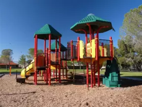 Tropical park with sky-high playground for older kids, toddler playground, fitness trail and stations, pale-lime gazebo, and spiffy basketball courts.