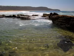 Beautiful beach with nice-shaped headland, rows of Norfolk pines, amber sand, rock pools with an abundance of life, and a street lined with cafes and shops across the highway.