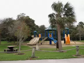 Park with shade, small playground, splash pad, and pier on the intracoastal.