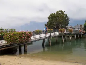 Touristy wharf with souvenir shops, mediocre restaurants, but gorgeous blue-green water and sometimes seals swimming by!