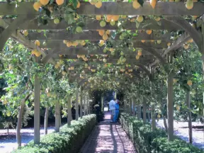 A tropical wonderland of palms, ferns, bromeliads, fountains, sculptures, rocks, ironwork gates, and pergolas, with the delightful scent of flowers filling the air.
