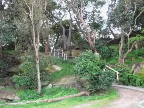 Cement ship playground with logs to climb, seal, dolphin, whale's tail and giant octopus sculptures, picnic tables, and an amazing view of Morro Rock and the inlet.