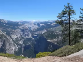 Breathtaking side-on view of half dome, three waterfalls, and the entire stunning valley.