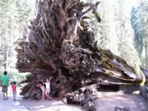 A redwood forest that looks like Northern California, with a playground and spacious knolly lawn.