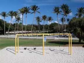 Paradise! A rare white sand beach in the Keys, with water of many shades of blue, and an ultra-modern playground amongst coconut trees with shaded huts.