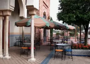 A Spanish paseo and courtyard with archways, little lights, flags, murals, lifelike statues, and fountains. At night, a magical spot!