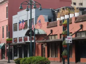 A main street of late 19th century storefronts, popular cafes, and a hip college scene. Recently, suffering an epidemic of homelessness relating to mental health problems.