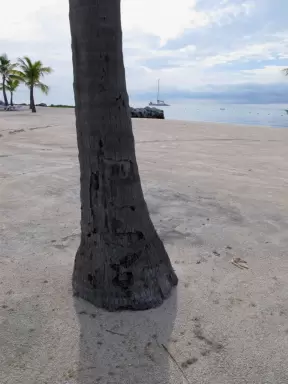 Paradise! A rare white sand beach in the Keys, with water of many shades of blue, and an ultra-modern playground amongst coconut trees with shaded huts.