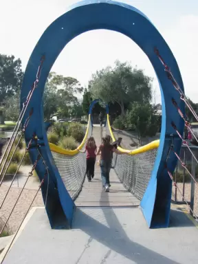 A super fun park with several unusual playgrounds, a rockclimbing wall, a Southern Pacific railroad engine, a swaying bridge, huge wavy slides on a hill, cement tunnels and more!