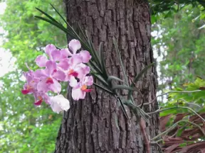 A tropical wonderland of palms, ferns, bromeliads, fountains, sculptures, rocks, ironwork gates, and pergolas, with the delightful scent of flowers filling the air.